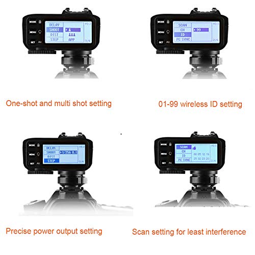 - تصميم سهل الاستخدام - تم ترقية الزناد x2t الذي يعمل بالتحكم عن بعد من جودوكس من زناد فلاش x1t، مع 5 مجموعات و32 قناة وشاشة LCD كبيرة وسهولة أكثر في التحكم بجميع الإعدادات و99 إعداد معرف راديو لمنع التداخل من الأجهزة الأخرى القريبة، مع مسافة وظيفة تصل إلى 100 متر