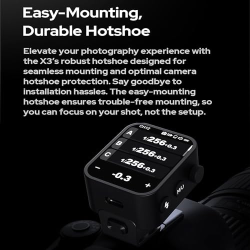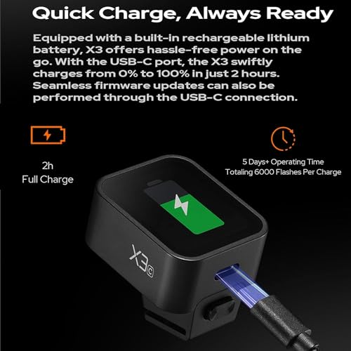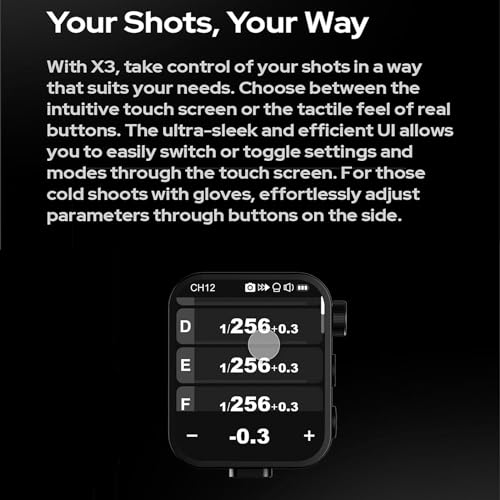 - 【شاشة لمس كاملة الألوان】 اشعر بسهولة التحكم عند أطراف أصابعك. تنقّل بسهولة عبر واجهة X3-C سهلة الاستخدام بتمرير ولمسة بسيطة. مثل غيره من أجهزة التحكم بالفلاش من جودوكس، يدعم X3 وضع تي تي ال ووضع الفلاش المتعدد، بالإضافة إلى اتش اس اس، والمزامنة مع الستارة الأمامية والخلفية. ارتقِ بمستوى سير عملك مع تحكم بديهي وأوضاع فلاش متعددة الاستخدامات.