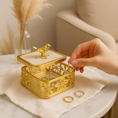 Generic - حامل مجوهرات مزخرف فريد بتصميم زهور مع مقبض مجسم طائر وقاعدة اكريليك شفافة قوية وغطاء قابل للإزالة للتعبئة والتفريغ بدون مجهود، لون ذهبي
