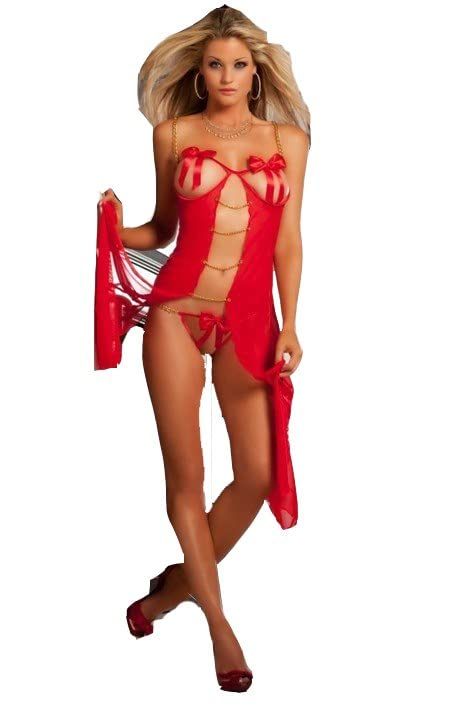 Generic - لانجيرى تل احمر مزين بسلاسل دهبى و كبات مفتوحة جذاب للنساء