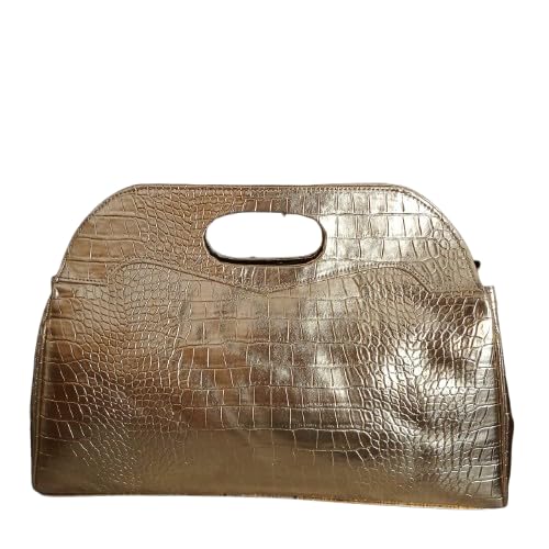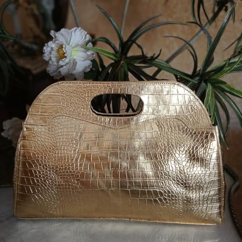 Generic - Gold Croc Embossed Clutch Bag, Metallic Faux Leather, Oval Handle, Evening Handbag