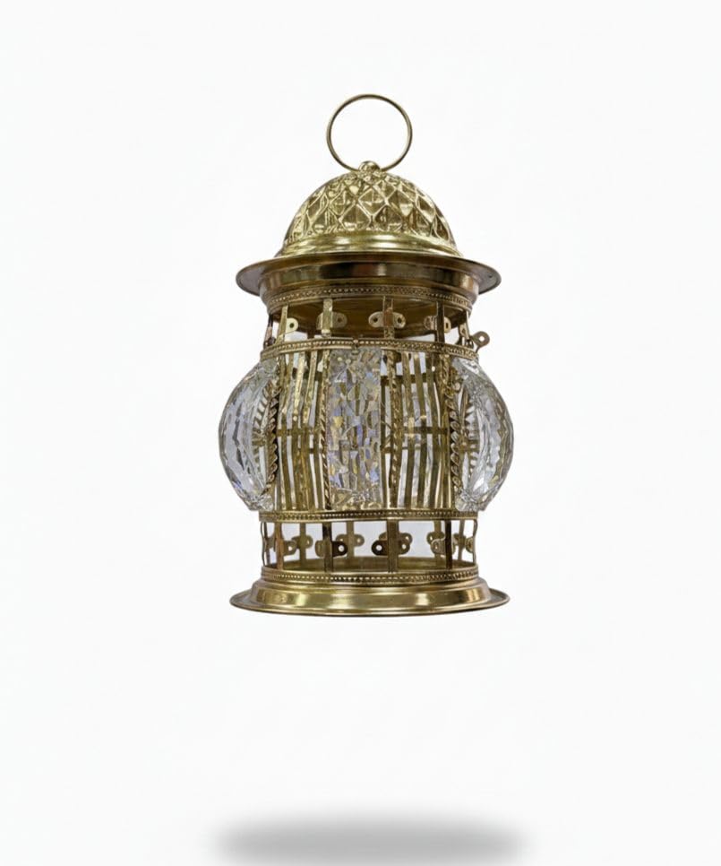 - تصميم عربي تقليدي فاخر: فانوس رمضان بتصميم ملكي يجمع بين الأصالة والفخامة، يتميز بإطار معدني ذهبي اللون مع زجاج كريستال منقوش يعكس الضوء بشكل ساحر