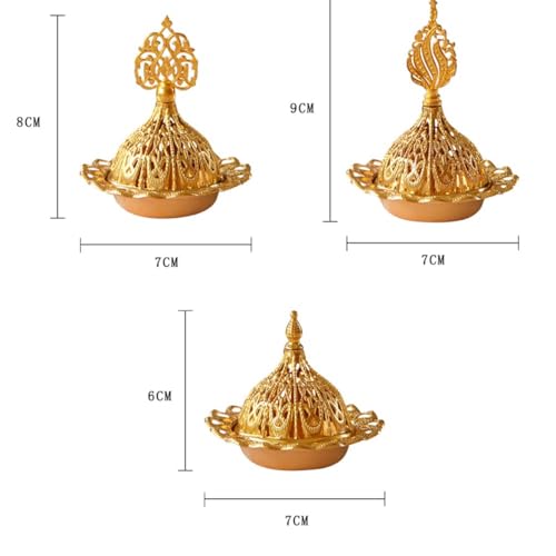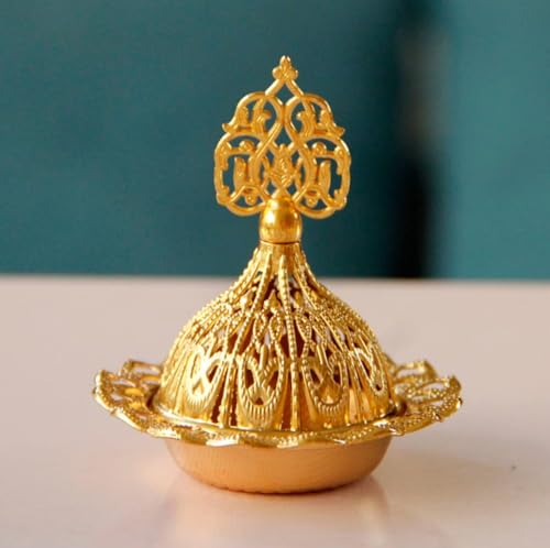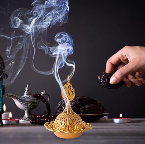Generic - مبخرة ذهبية بتصميم عربي عتيق، مبخرة معدنية بخاصية اطلاق الروائح العلاجية، حامل شموع للزينة الاسلامية لشهر رمضان المبارك والعيد (1)