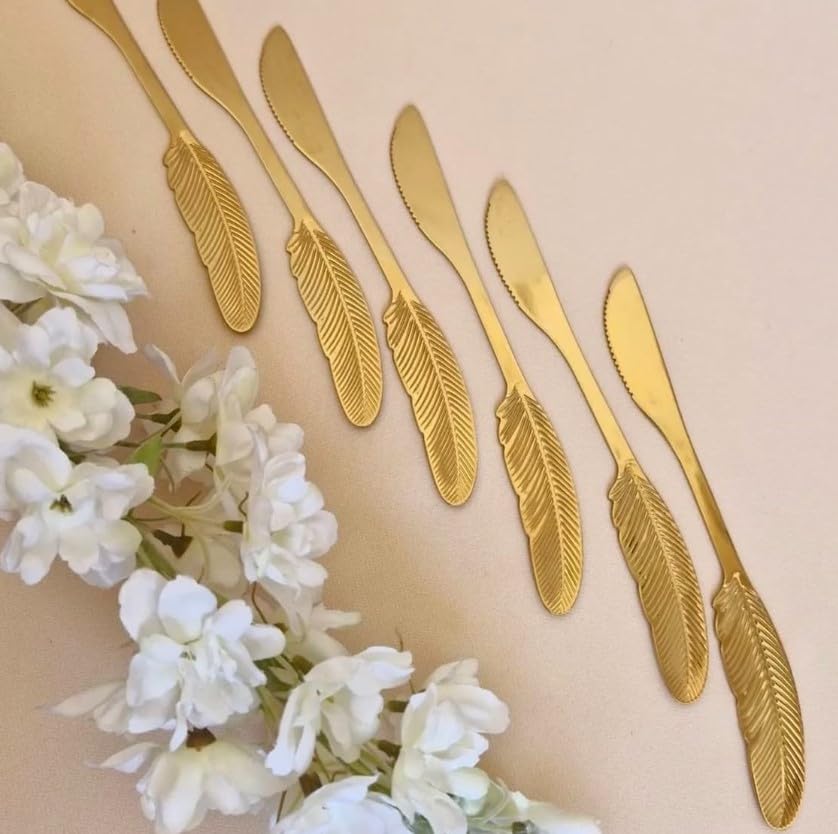 Generic - سكاكين حلويات من الفولاذ المقاوم للصدأ بتصميم ريشة ذهبية، مجموعة من 6 قطع 18/10، أدوات مائدة للكيك والمعجنات وتقديم الحلويات، اكسسوارات طاولة طعام أنيقة