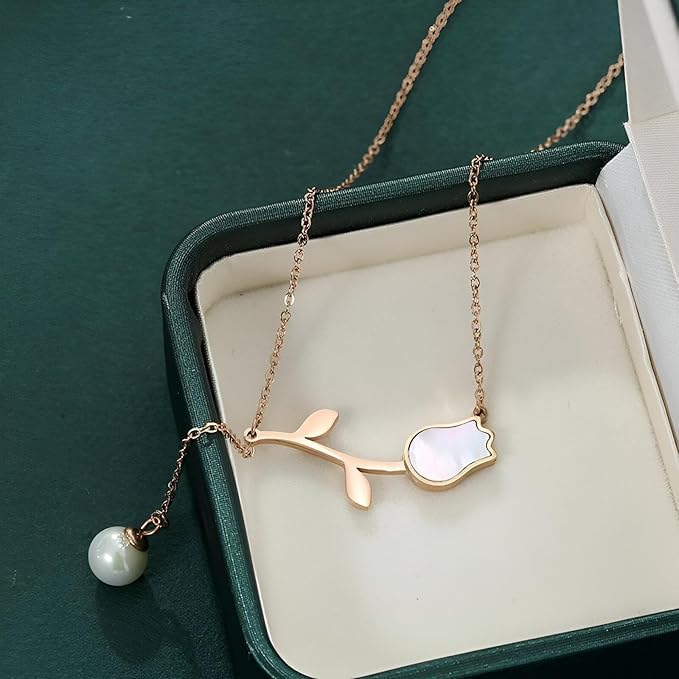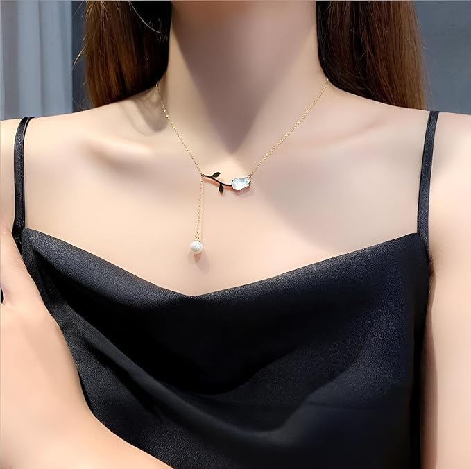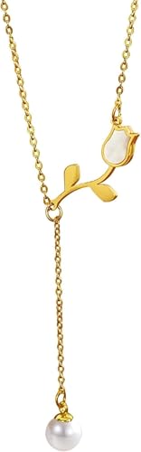 Generic - قلادة ذهبية بتصميم وردة مع لؤلؤة، سلسلة طويلة، مجوهرات نسائية أنيقة