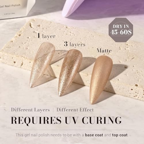 - درجة ذهبية فاخرة متلألئة: طلاء جل ذهبي معدني دافئ يمنح الأظافر لمعانًا غنيًا ومشرقًا ومناسب للحفلات والإطلالات المسائية والمناسبات الخاصة.