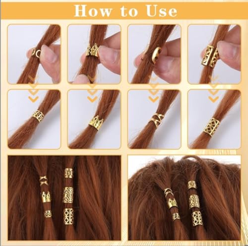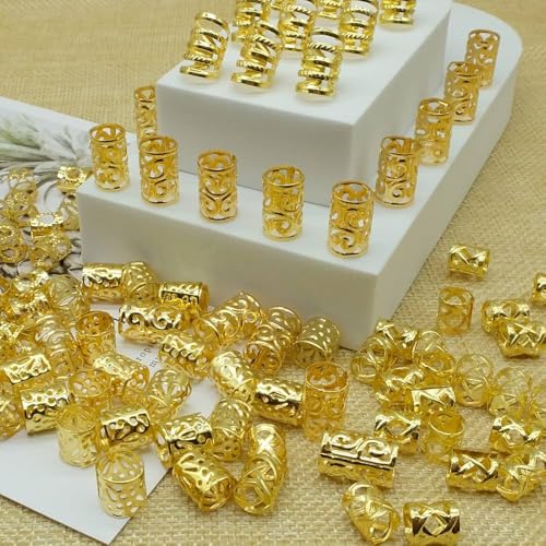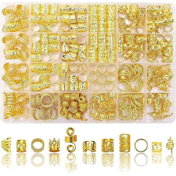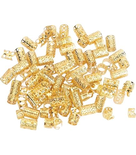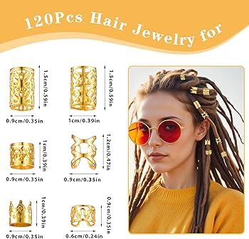 - تصميم أنيق: حلقات ومشابك شعر بلون ذهبي لامع مع نقوش وأشكال متنوعة تضيف لمسة جمالية راقية لتسريحات الشعر المضفرة