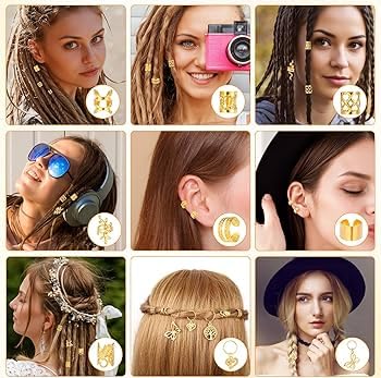 - محتوى العبوة: مجموعة من 9 قطع من إكسسوارات الشعر الذهبية المتنوعة تشمل حلقات ومشابك معدنية مصممة خصيصاً لتزيين الضفائر
