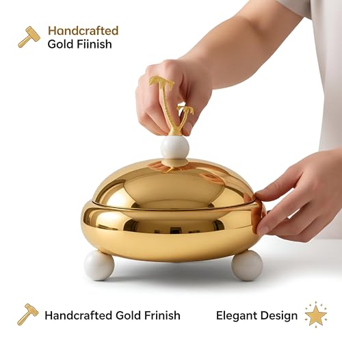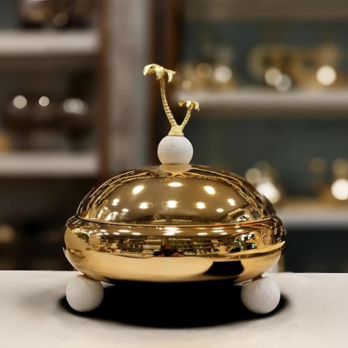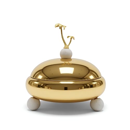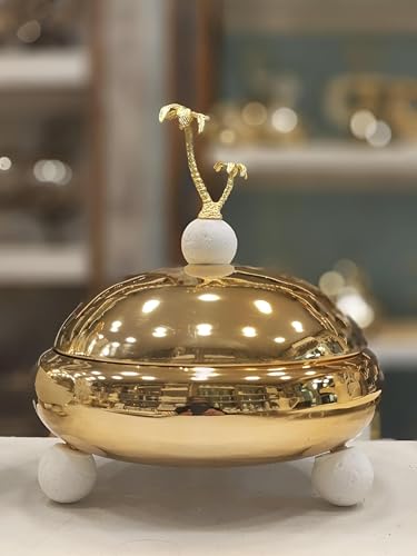 - مصقولة يدويًا بلمسة نهائية ذهبية لامعة، تشع هذه الصينية بالدفء والفخامة، وتعرض بشكل مثالي التمر والبقلاوة والحلويات التقليدية الأخرى مع لمعان يعزز الأجواء المقدسة لليالي رمضان.