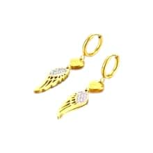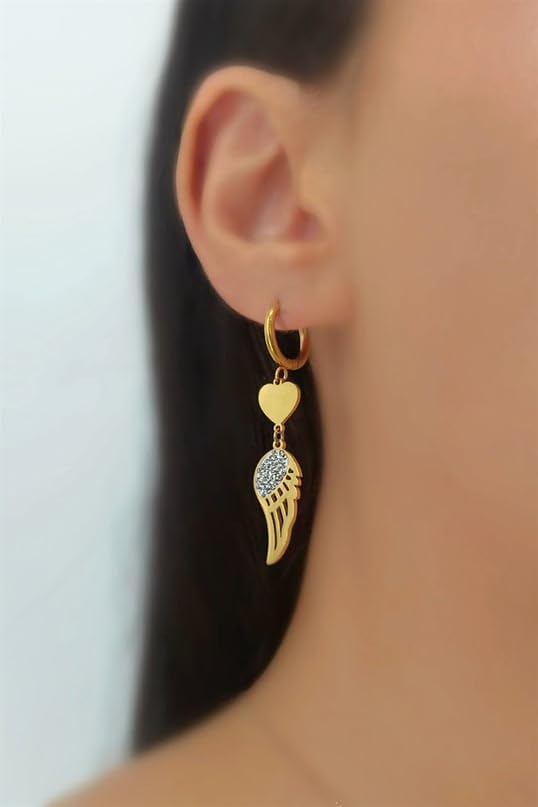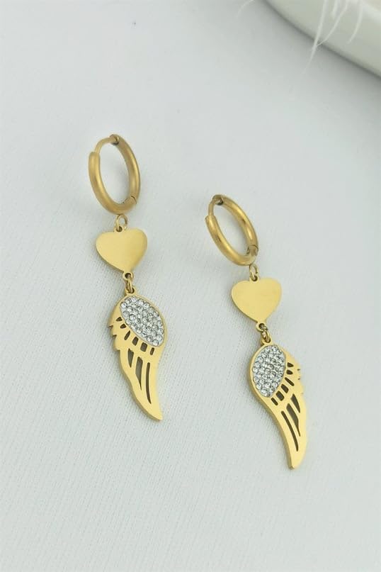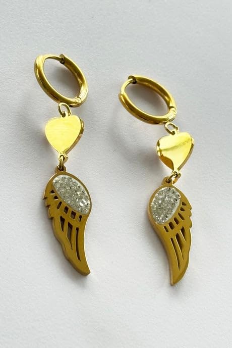 عام - اقراط متدلية مطلية بالذهب على شكل جناح ملاك مع لمسات من الكريستال ودلاية على شكل قلب، نمط هوجي هوب