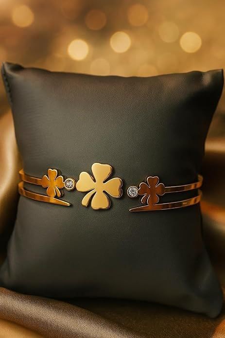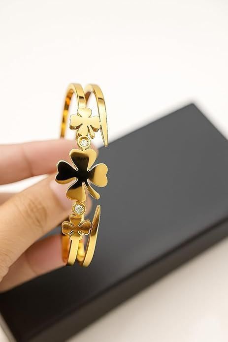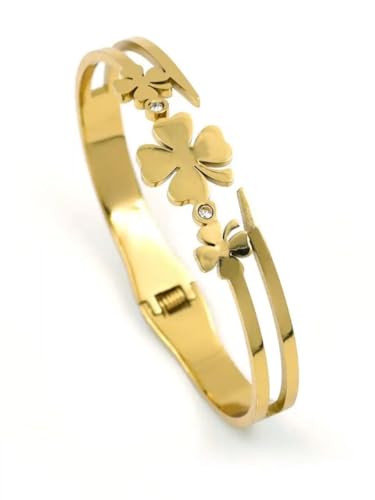 Generic - سوار عريض مطلي بالذهب من الستانلس ستيل باربع اوراق برسيم، مجوهرات بتصميم مفتوح قابل للتعديل للنساء