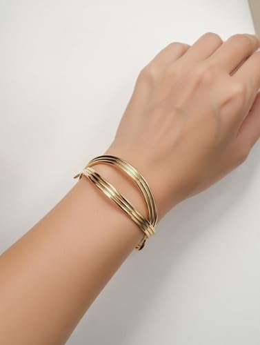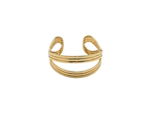 Generic - سوار عريض عريض متعدد الطبقات مطلي بالذهب من الستانلس ستيل، تصميم مفتوح قابل للتعديل، خطوط ثلاثية منحوتة منحنية، مجوهرات عصرية بسيطة للنساء