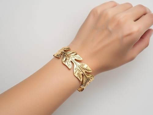 Generic - سوار عريض من الستانلس ستيل المطلي بالذهب بتصميم مفتوح قابل للتعديل واوراق نباتية كبيرة الحجم مع لمسة نهائية مزخرفة مستوحاة من الطبيعة للنساء