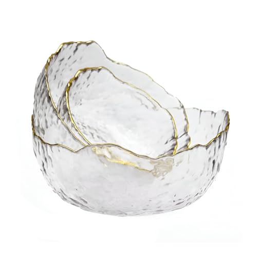 - يُظهر الهيكل الزجاجي الشفاف للوعاء ملمسًا مطروقًا يلتقط الضوء ويعكس الضوء، مما يخلق تأثيرًا بصريًا لامعًا يبرز الألوان الزاهية للسلطات أو الفواكه أو الحلويات، بينما تضيف الحافة الذهبية الفاخرة لمسة راقية إلى أي إعداد طاولة.