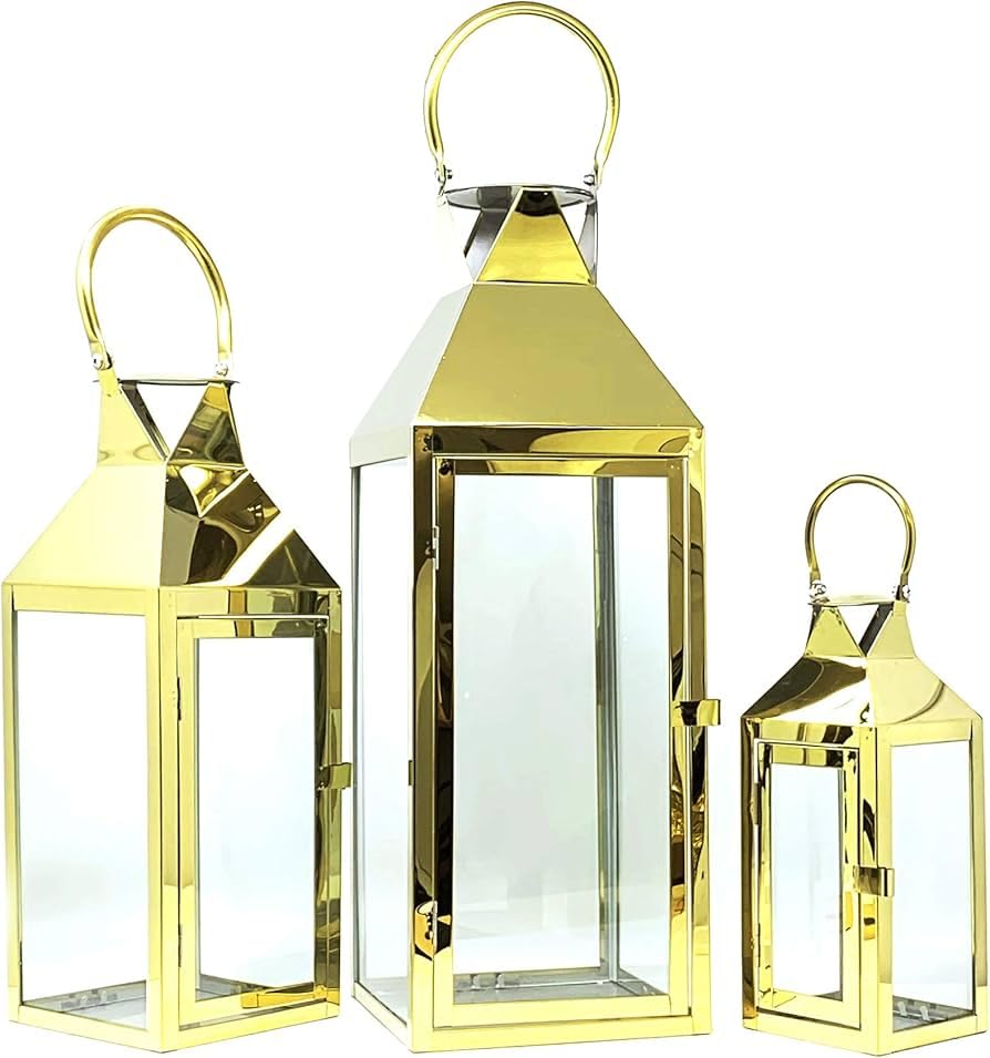 Generic - مجموعة فوانيس رمضان ذهبية من الستانلس ستيل والزجاج، 3 قطع حوامل شموع مزخرفة مع باب مفصلي، ديكور عصري للاستخدام الداخلي والخارجي