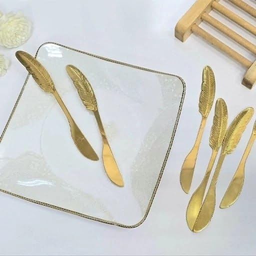Generic - طقم سكاكين ستانلس ستيل ذهبي 6 قطع تصميم ريشة لتقطيع الكيك والحلويات والتورتة أدوات تقديم فاخرة ومريحة للمناسبات والعزومات