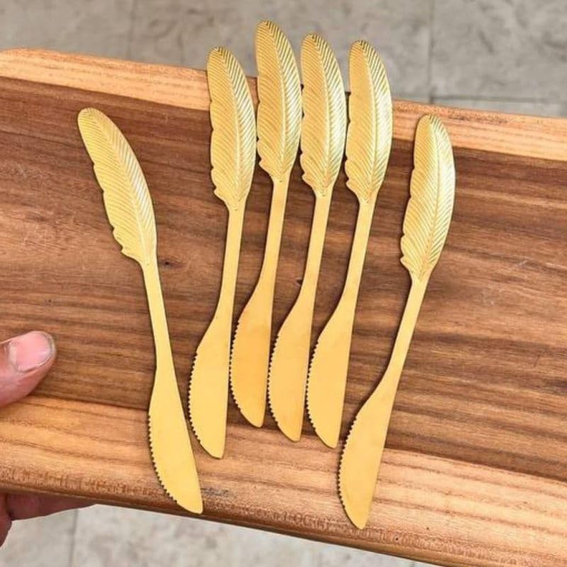 Generic - طقم سكاكين ذهبية ستانلس ستيل 6 قطع تصميم ريشة لتقطيع الكيك والحلويات والتورتة أدوات تقديم فاخرة ومتينة للعزومات والمناسبات