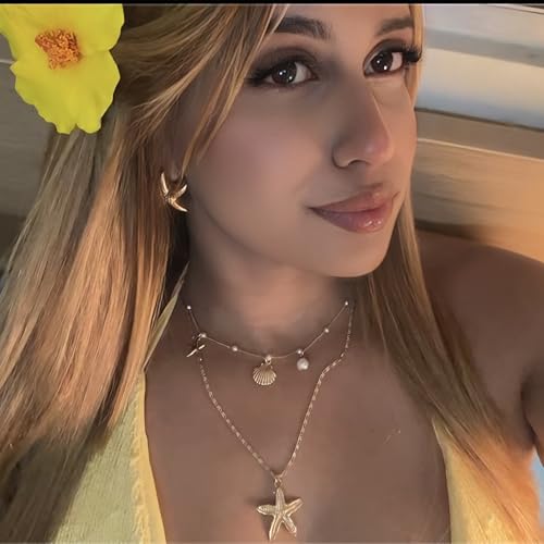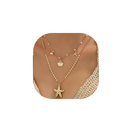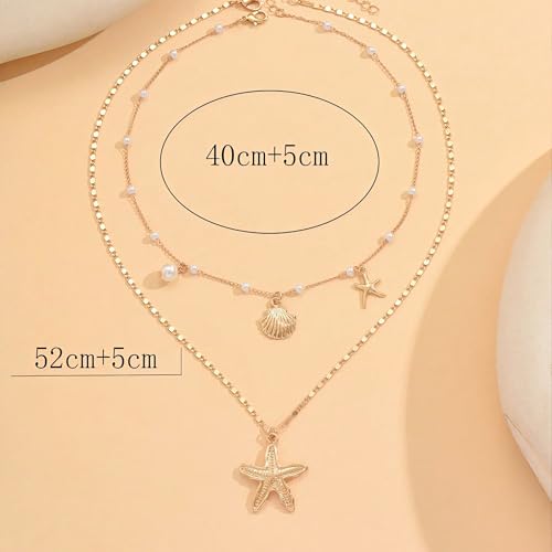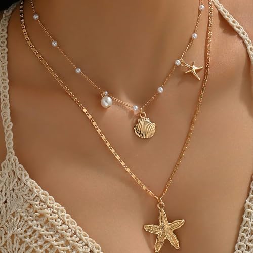 VIEKYBUTTY - قلادة ذهبية بطبقات ونجم البحر واللؤلؤ للنساء - مجوهرات شاطئ لا تفقد بريقها مطلية بالذهب للعطلات والتنقل اليومي والصيف