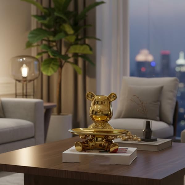 - تصميم فاخر: تمثال دب مذهل بلمسة نهائية ذهبية يمكن استخدامه كصينية راقية، مما يضيف لمسة زخرفية أنيقة إلى أي غرفة.