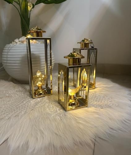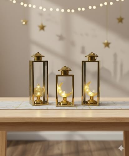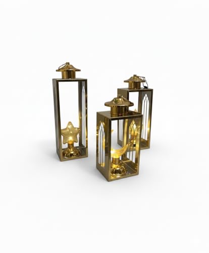 Generic - فوانيس زينة معدنية ذهبية، طقم 3 قطع، تصميم نجمة وهلال، ديكور رمضاني