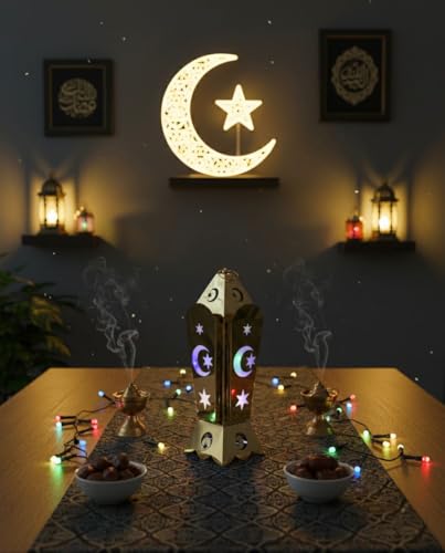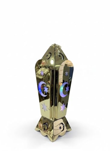 Generic - فانوس رمضان ذهبي مع إضاءة داخلية LED، تصميم هلال ونجوم، ديكور رمضاني مضيء للمنزل والطاولة
