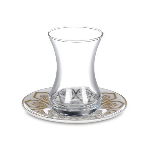 Generic - طقم شاي عربي من جولدن ستار، 12 قطعة لـ 6 اشخاص، زجاج مع صحن بورسلين - ابيض وذهبي