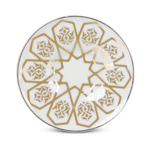 - تصميم أنيق: يتميز بصحن بورسلين أبيض مذهل مزين بأنماط نجوم هندسية ذهبية معقدة مستوحاة من الزخارف العربية التقليدية، مما يضيف الرقي إلى خدمة الشاي الخاصة بك