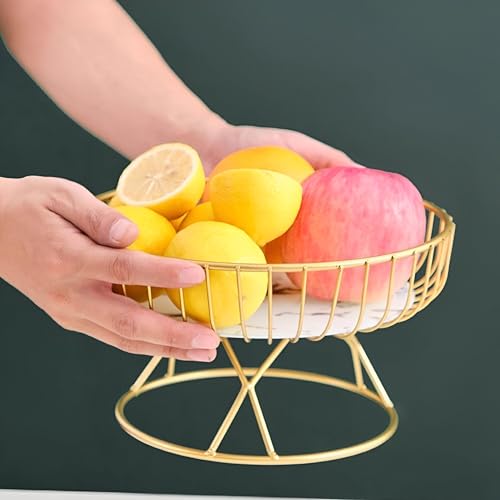 Generic - سلة سلكية ذهبية - حامل فاكهة مزخرف، صينية رخامية انيقة لغرفة المعيشة والمطبخ، طبق حلوى وتخزين الفاكهة، وعاء تقديم معدني فاخر (23 سم)