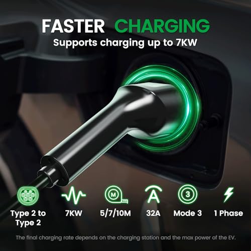 GONEO - كابل شحن نوع 2 7 كيلو وات 32 امبير وطول 7 متر، كابل شحن سيارة كهربائية نوع 2 وضع 3 أحادي الطور للسيارات الكهربائية/ الكهربائية الهجينة القابلة للشحن نوع 2 إلى النوع 2/CSS2 مع شنطة حمل من جونيو