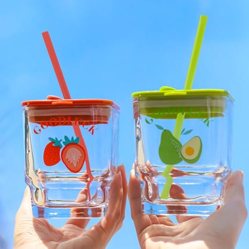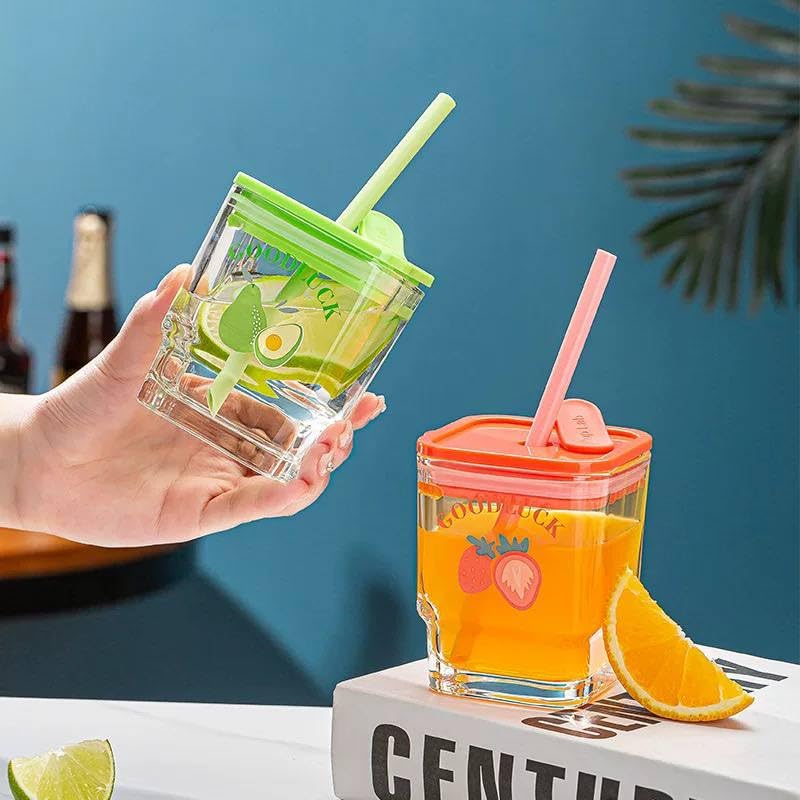Generic - Good Luck أكواب زجاجية للمشروبات والعصائر مع غطاء وقش، تصميم فواكه الفراولة والأفوكادو، 3 قطع، مع أغطية ملونة برتقالية وخضراء