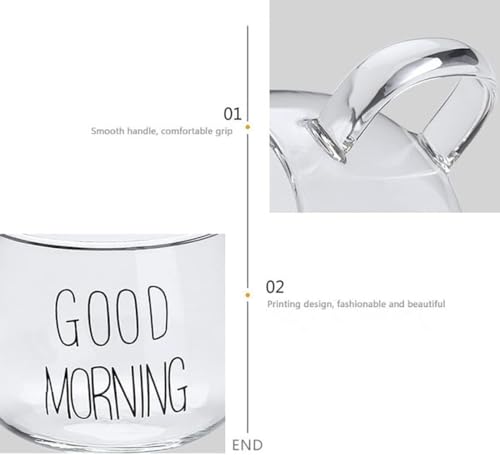- صباح الخير! لبداية كل يوم لطيف. كوب ماء زجاجي من جود مورنينج مكون من قطعتين مصنوع من زجاج بيركس بوروسيليكات الشفاف وهو أخف وزنًا وأكثر متانة من الزجاج التقليدي. تصميم جدار زجاجي واحد ولا يحتوي على أي وظيفة معزولة. أكواب جود مورنينج الزجاجية هي هدية مثالية لعيد الميلاد والعطلات وهدية عمل وهدية الذكرى السنوية للرجال والنساء. كما أنها هدية جيدة لأمك وأبيك.