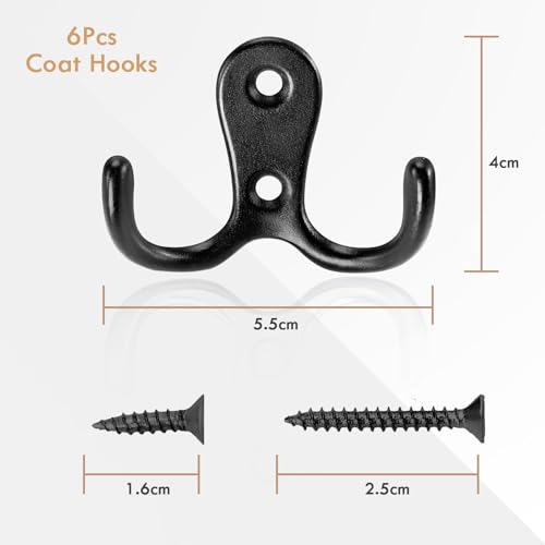Gorffy - خطافات معطف بتصميم عتيق مع مسامير، خطافات معدنية مزدوجة، خطافات معطف للجدار للحمام والمطبخ، أسود، 6 قطع من جورفي