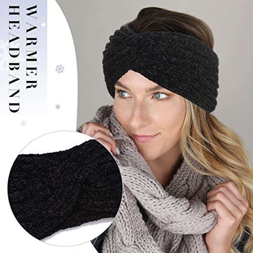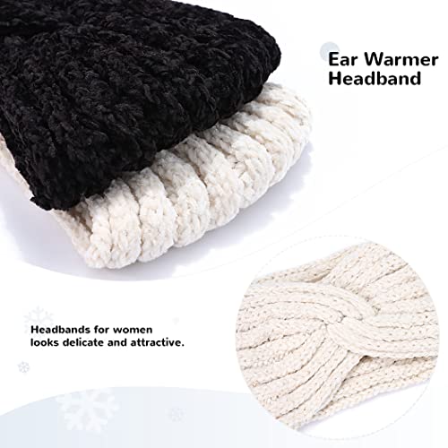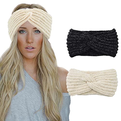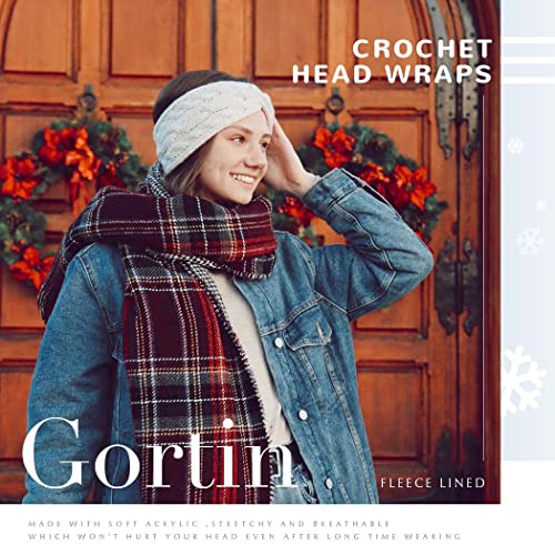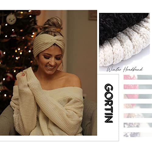 GORTIN - عصابات رأس شتوية محبوكة سوداء لتدفئة الأذن للنساء، أربطة رأس كروشيه مرنة مبطنة بالصوف للنساء، عبوة من قطعتين من جورتن (أسود وبيج)