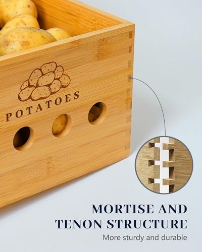 - قوية ومتينة: تخزين البطاطس مصنوع من خشب الخيزران عالي الجودة، طبيعي ومستدام، غير سام وعديم الرائحة، آمن للطعام ويمكن استخدامه لفترة طويلة. بالإضافة إلى ذلك، فإن وعاء البصل سهل التنظيف، لذلك لا داعي للقلق بشأن نمو البكتيريا بالداخل.