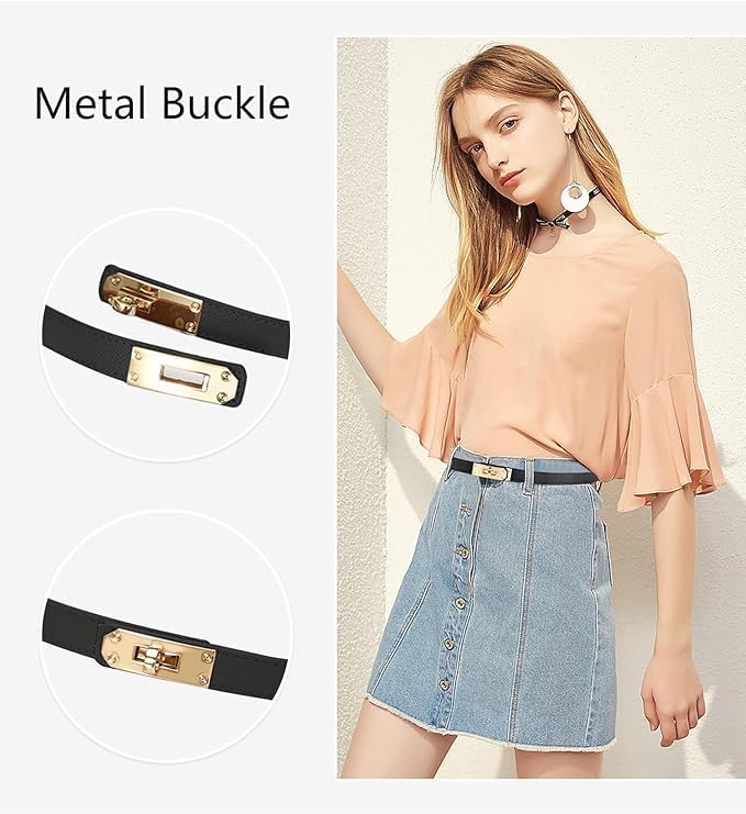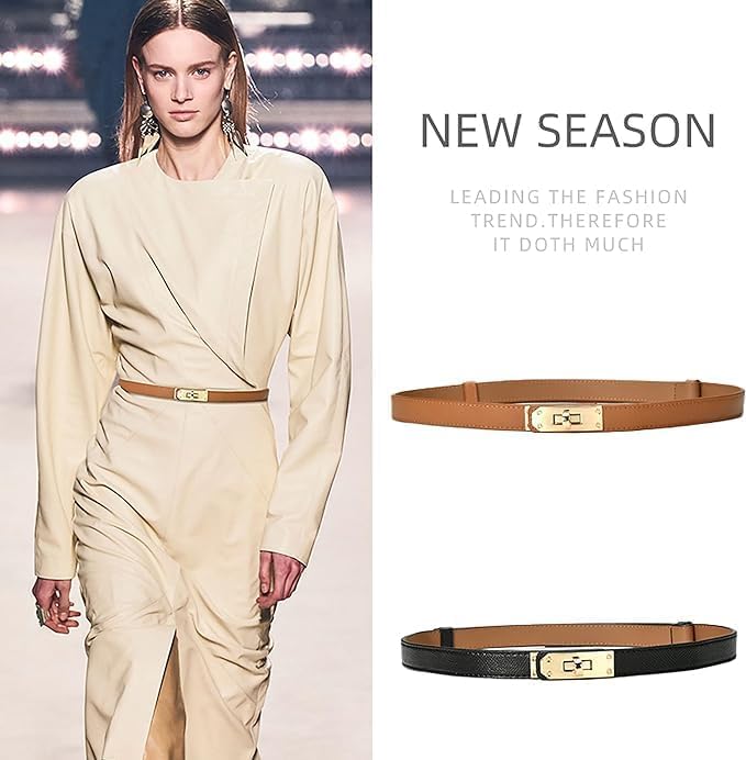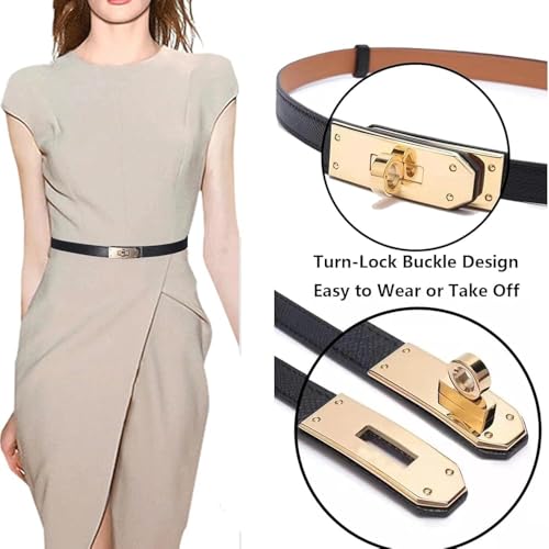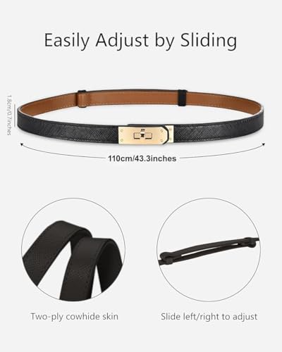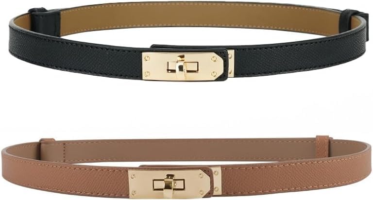 GQ - جي كيو حزام خصر جلدي رفيع للنساء من قطعتين، عصري مع ابزيم قابل للتعديل بقفل دوار - مثالي للفساتين والجينز والبناطيل والمعاطف (اسود + بني)
