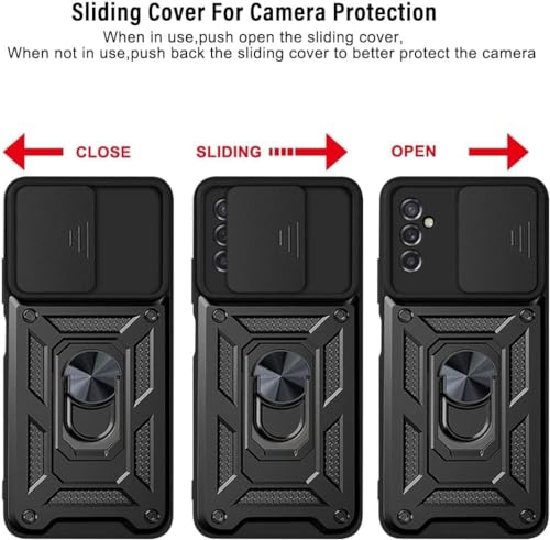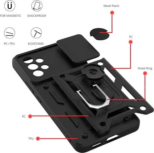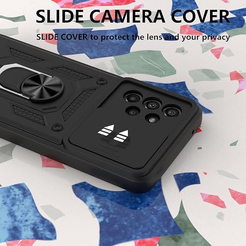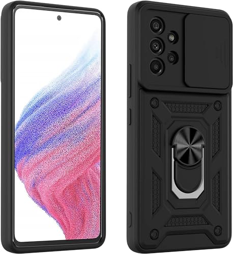 Generic - جراب حماية خلفي ممتاز متوافق مع سامسونج جالاكسي / A52S / شبكة الجيل الخامس 5G غطاء منزلق للكاميرا وحامل حلقي مدمج مضاد للصدمات A52/ / (أسود)، بلاستيك