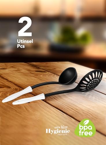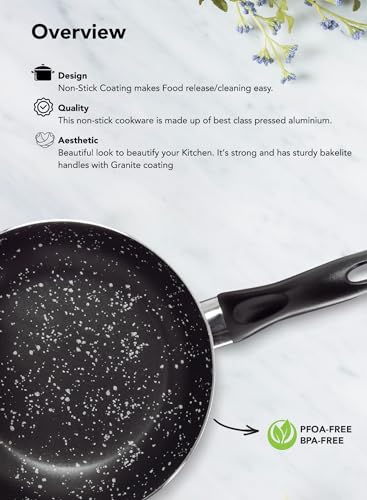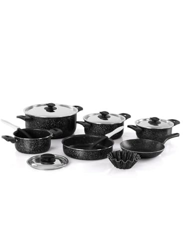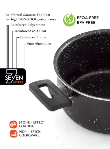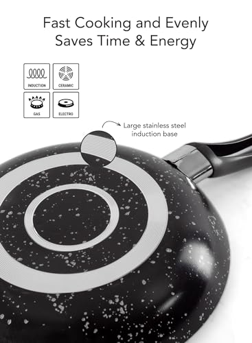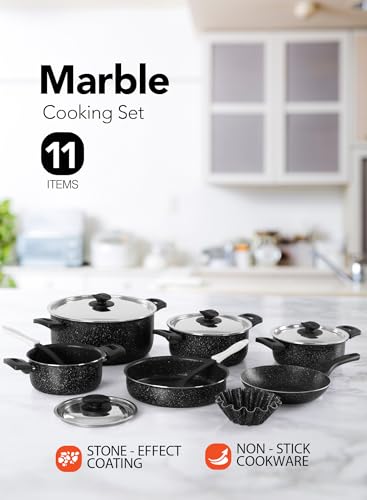 GRANDI - طقم أواني الطبخ من جراندي، مطلي بالرخام باللون الأسود الجرانيت، مقاوم للالتصاق وآمن في غسالة الأطباق وخالي من PFOA، يتكون من 11 قطعة