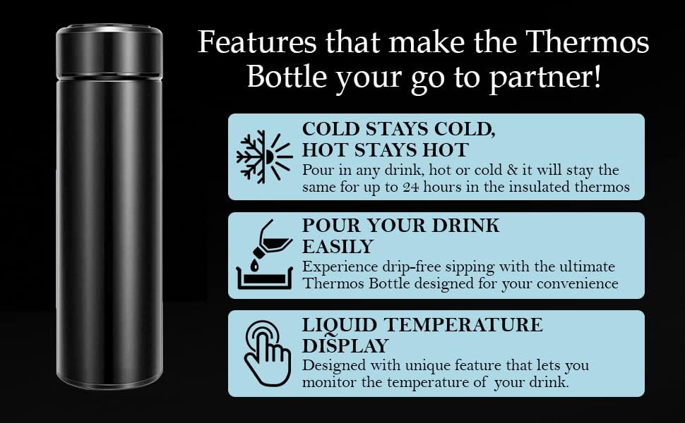 - تبقى باردة وساخنة وتبقى ساخنة:- الشيء الأكثر روعة في زجاجة الترمس المصنوعة من الستانلس ستيل مع شاشة عرض درجة حرارة السائل هو أنها تحافظ على المشروبات الساخنة والباردة باردة، لمدة تصل إلى 12-24 ساعة، سواء كانت قهوة ساخنة أو شاي مثلج مبرد.