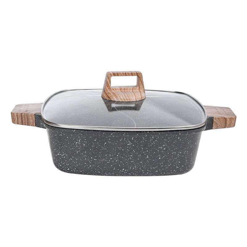 Generic - مقلاة عميقة من الجرانيت مع غطاء زجاجي ومقابض خشبية، ٢٨ سم، رمادي