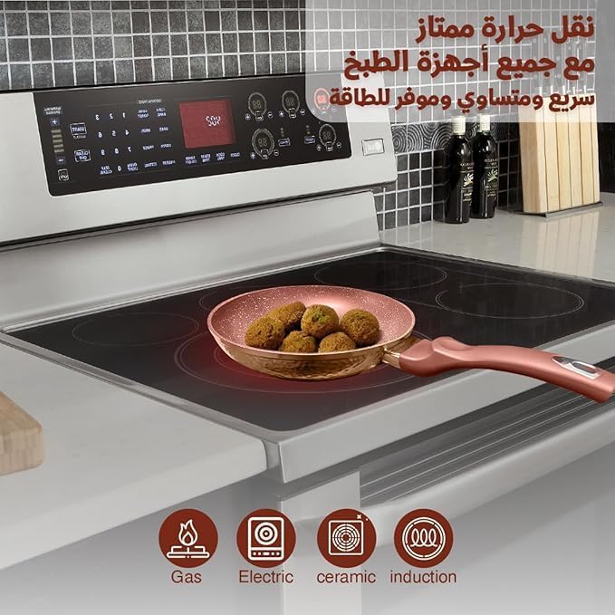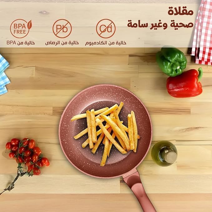 - طهي صحي غير لاصق - استمتع بالطهي بدون مجهود مع طلاء جرانيت مانع للالتصاق يتيح لك القلي والقلي والقلب دون فوضى. مثالية للوجبات العائلية المصرية اليومية.