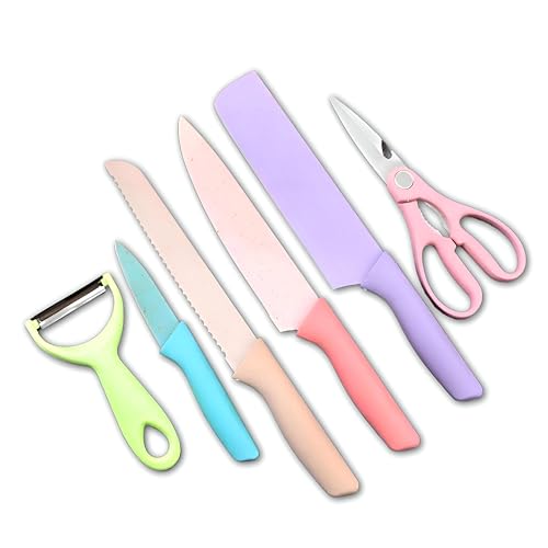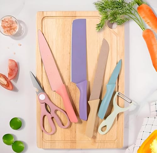 - مجموعة متكاملة لجميع احتياجات المطبخ تشمل سكين ساطور، سكين خبز مموج، سكين فاكهة، سكين تقشير، مقشرة سيراميك، ومقص مطبخ متعدد الوظائف لتغطية كل مهام التقطيع
