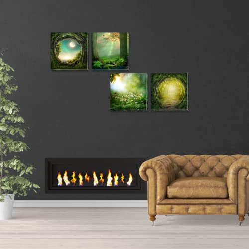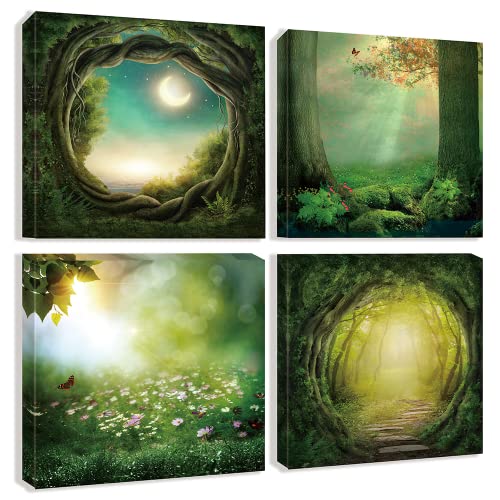 Generic - لوحات فنية جدارية مطبوعة على قماش بتصميم غابة خضراء مضحكة لبلاد العجائب، 4 قطع، صور منظر طبيعي لارض الخيال لغرفة الاطفال وغرفة المعيشة والحمام 12 انش × 12 انش، جرين فورست