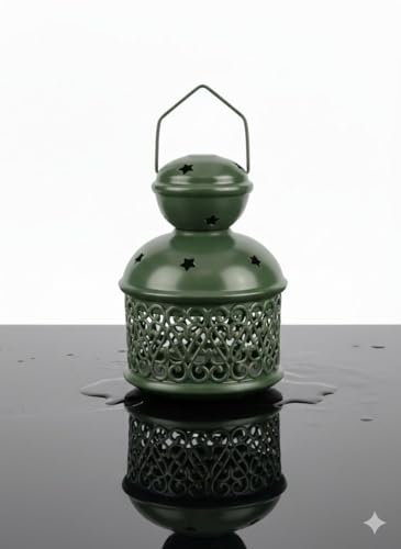 - تصميم فانوس زخرفي: فانوس معدني أخضر بتصميم عتيق مع نقوش زخرفية معقدة وفتحات على شكل نجوم تسمح بتوزيع الضوء بشكل جميل