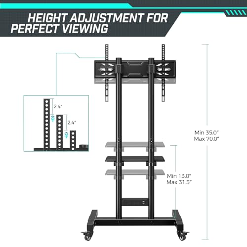 - 【عربة تلفزيون دوارة بارتفاع قابل للتعديل】حامل تلفزيون خارجي جرينستل بارتفاع قابل للتعديل من 35 بوصة إلى 70 بوصة، ويمكن أيضًا تعديل رف الوسائط القوي من 13 بوصة إلى 31.5 بوصة، لتوفير زاوية رؤية أكثر راحة