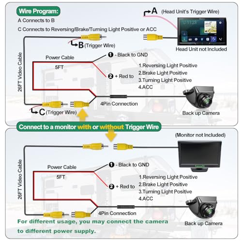 - كابل فيديو مزدوج الحماية لكاميرا الرؤية الخلفية ايه اتش دي، يوفر أفضل جودة نقل للفيديو دون فقدان أو تدهور في الإشارة. مزودة أيضًا بكابل طاقة 4 منافذ عالي الجودة، ولضمان صورة واضحة وتوافق كامل مع جميع الأجهزة، يُرجى استخدام جميع الأسلاك المرفقة في العبوة نظرًا لاختلاف تعريفات بعض الكابلات ذات الـ 4 منافذ.