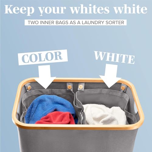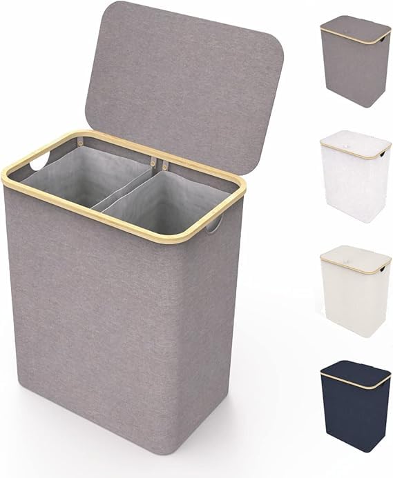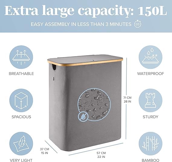 Generic - سبت غسيل مزدوج بلون رمادي - مقاس كبير جدا جدا XXL 150 لتر - قسمين - غطاء من البامبو - أكياس غسيل قابلة للإزالة