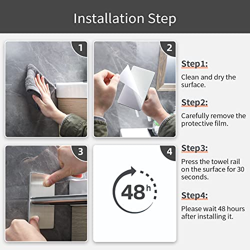 - سهل التركيب: تركيب ذاتي اللصق بدون ثقب، لا يتلف الجدار. ببساطة قم بإزالة الصمغ الفائق، والصق قضيب المنشفة على الحائط واضغط عليه لبضع ثوانٍ.