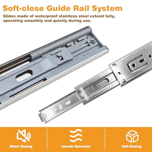 - زلاجات ناعمة الإغلاق: تتميز الشرائح الموجودة على درج الخزانة الممتد بالكامل بتصميم ناعم الإغلاق، والذي لا يوفر تجربة سحب كاملة سلسة وهادئة، ولكن أيضًا تجنب الاصطدام عند الإغلاق. مصنوعة من الستانلس ستيل الثقيل، هذه الشرائح مقاومة للرطوبة والصدأ، وتم اختبارها بدقة لضمان متانة تدوم مدى الحياة.