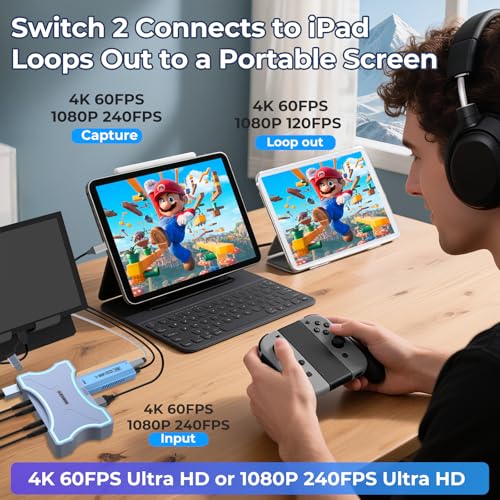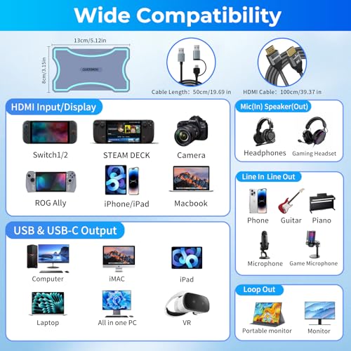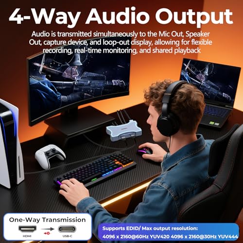 - 【أربعة مخارج صوتية للمراقبة والمشاركة】يوفر أربعة خيارات إخراج صوتية متزامنة: صوت جهاز الالتقاط، تمرير HDMI، مخرج صوت، ومخرج سماعة. قم بتوصيل السماعات وسماعات الرأس بسهولة للمراقبة المرنة أو تشغيل جماعي أثناء البث أو التسجيل.