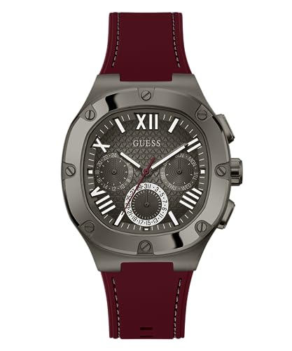 GUESS - جيس ساعة للرجال 42 ملم - سوار احمر ومينا رمادي داكن وهيكل تناظري